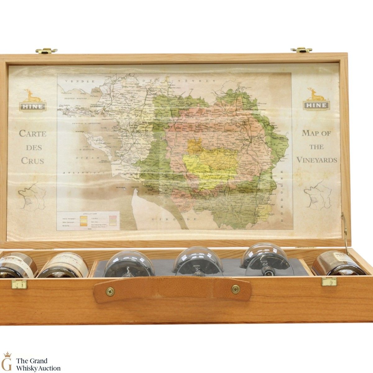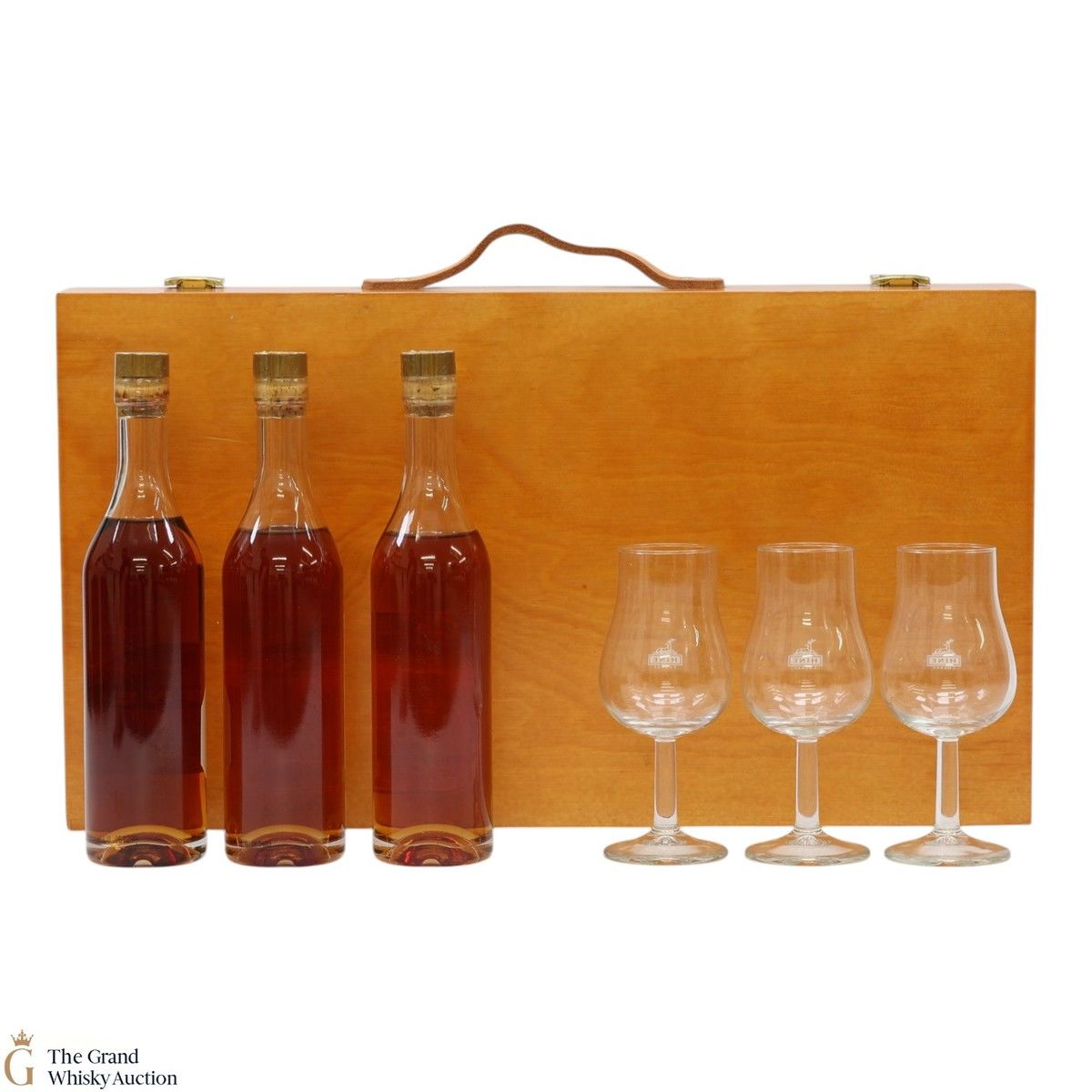 A set of three 20cl bottles of Hine Cognac presented with three nosing glasses in a branded wooden suitcase: