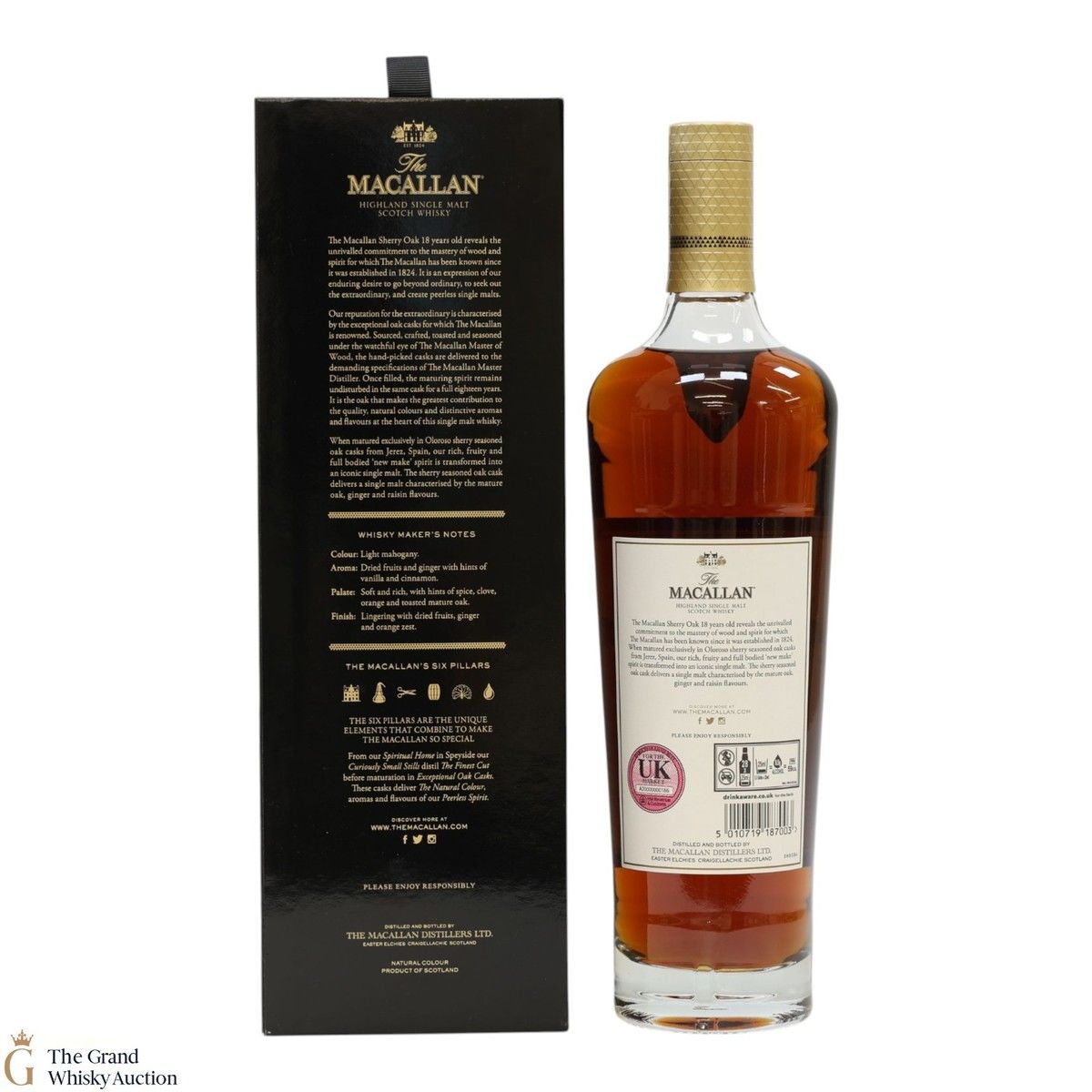 This annual release of The Macallan's popular 18 Year Old Sherry Oak is matured exclusively in sherry seasoned casks, built from both Spanish and American oak, providing a beautifully dark flavour with rich aromas.