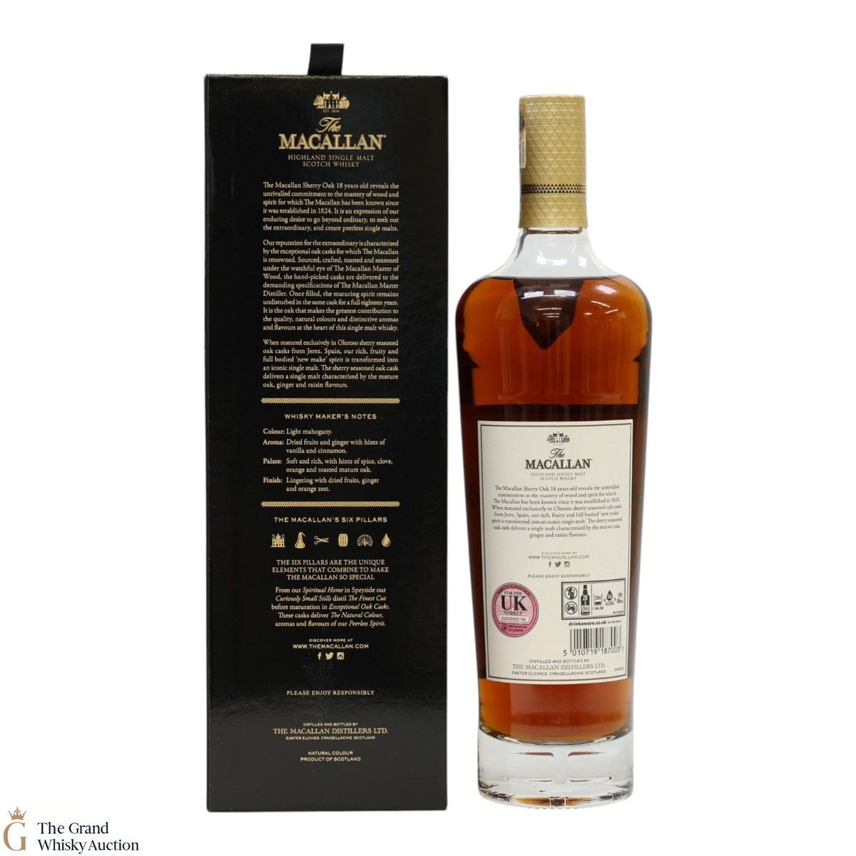 This annual release of The Macallan's popular 18 Year Old Sherry Oak is matured exclusively in sherry-seasoned casks, built from both Spanish and American oak, providing a beautifully dark flavour with rich aromas.