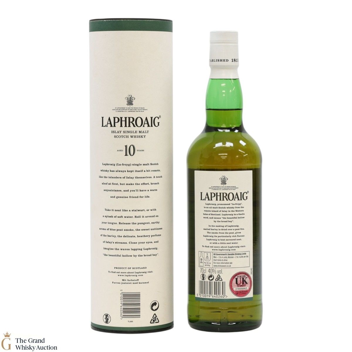 A 70cl of the medicinal 10 year old from Islay's bestselling distillery, Laphroaig. In making Laphroaig, malted barley is dried over a peat fire. The smoke from this peat, found only on Islay, gives Laphroaig its particularly rich flavour.