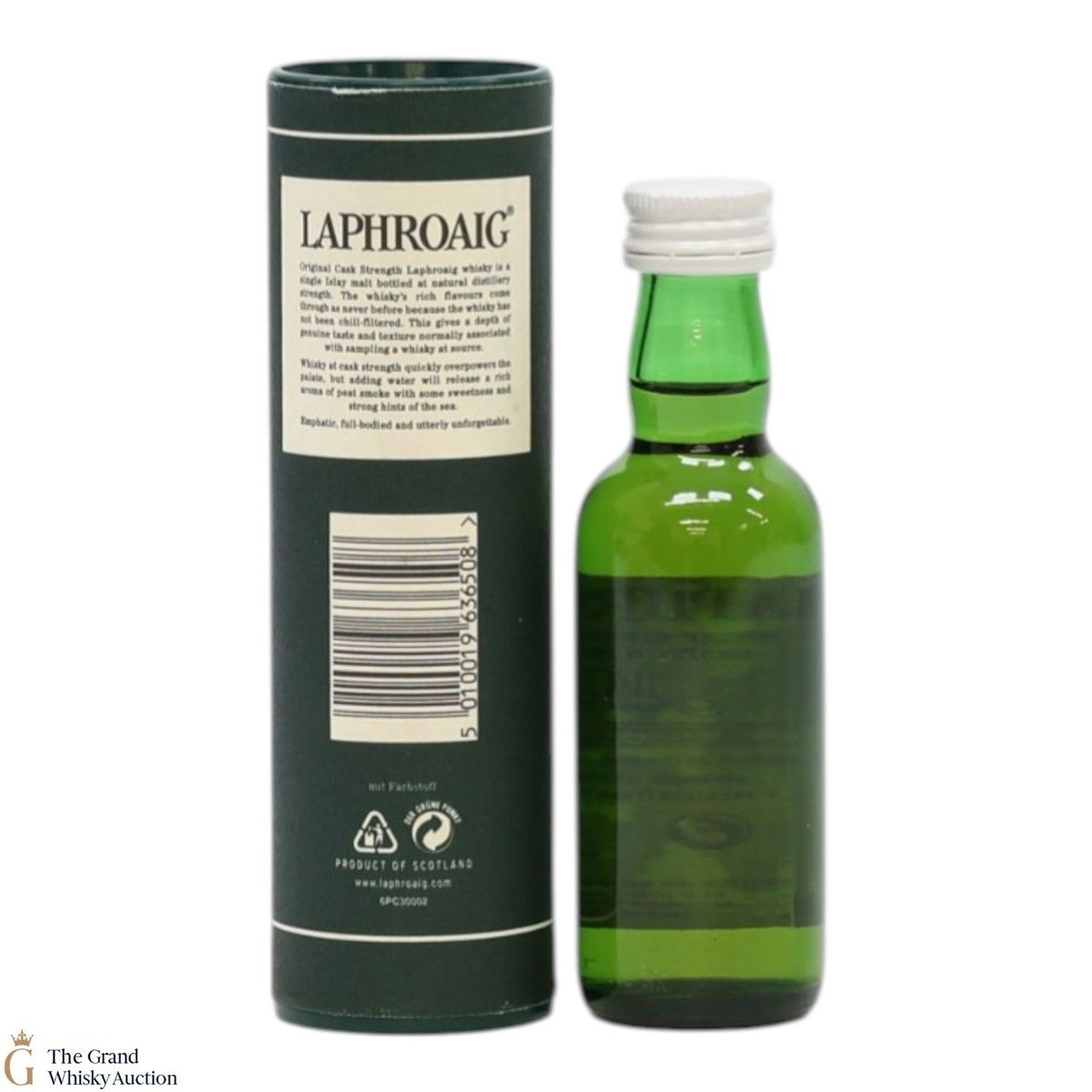 A 5cl of Laphroaig 10-year-old original cask strength, bottled at 55.7% ABV.
