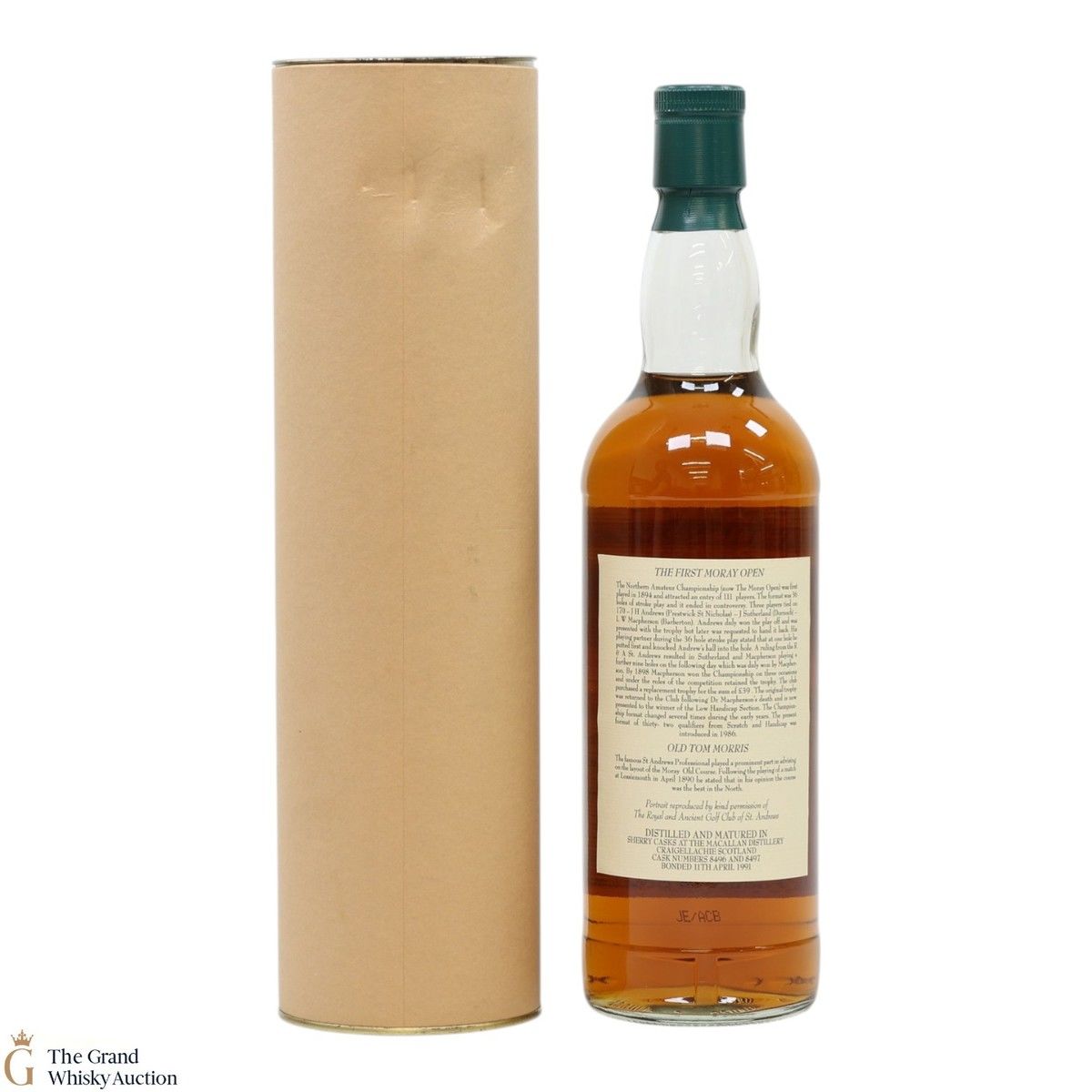 This bottle was bonded in April 1991 before being matured for 14 years in sherry casks #8496 and #8497 at the Macallan Distillery to commemorate the 100th Moray open in Lossiemouth, July 2005.