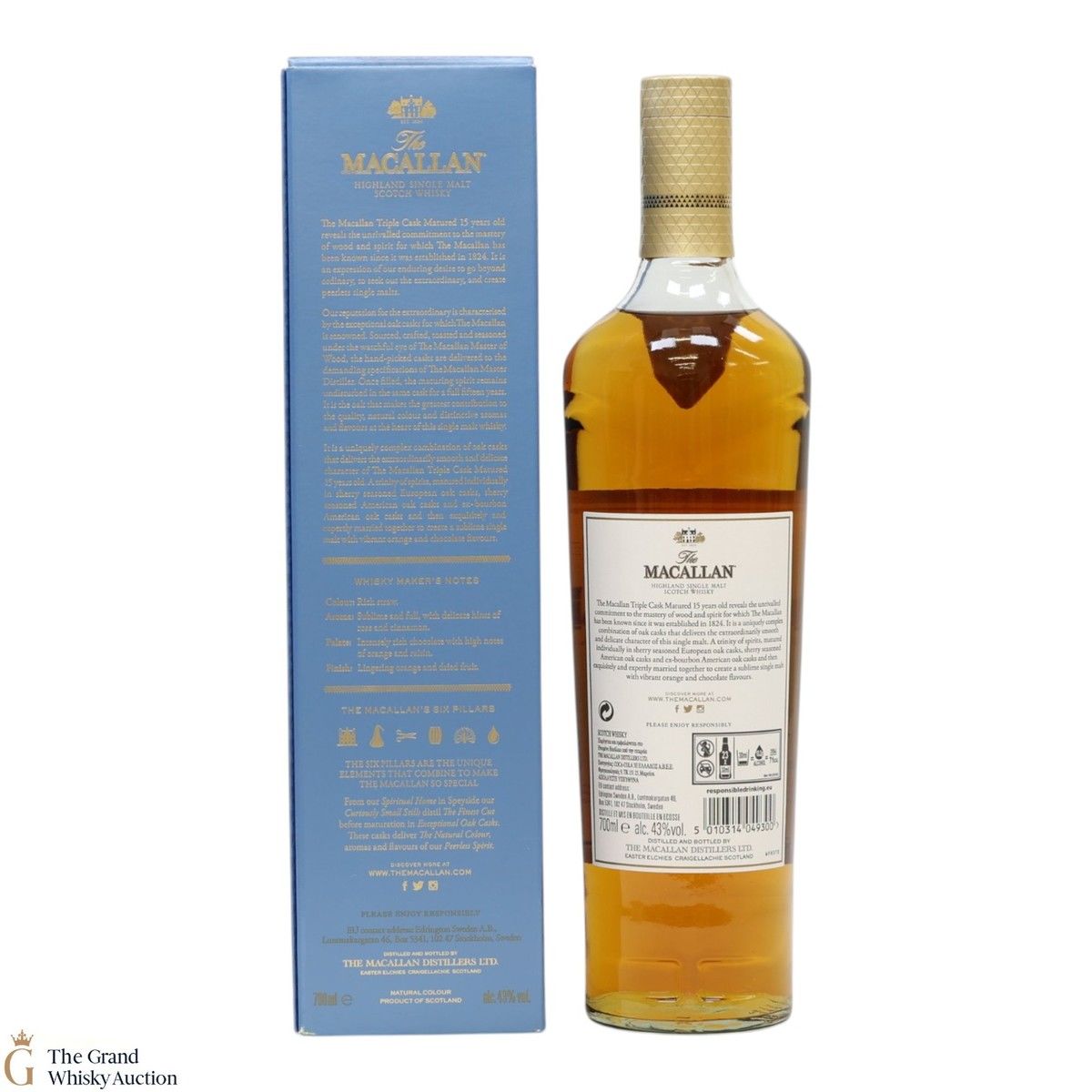 This 15-year-old Macallan single malt was released in 2018 as part of the Triple Cask range (which was brought out to replace the Fine Oak range in 2018). This whisky has been matured for 15 years in a combination of European sherry seasoned casks, American sherry seasoned casks and American ex-bourbon casks.