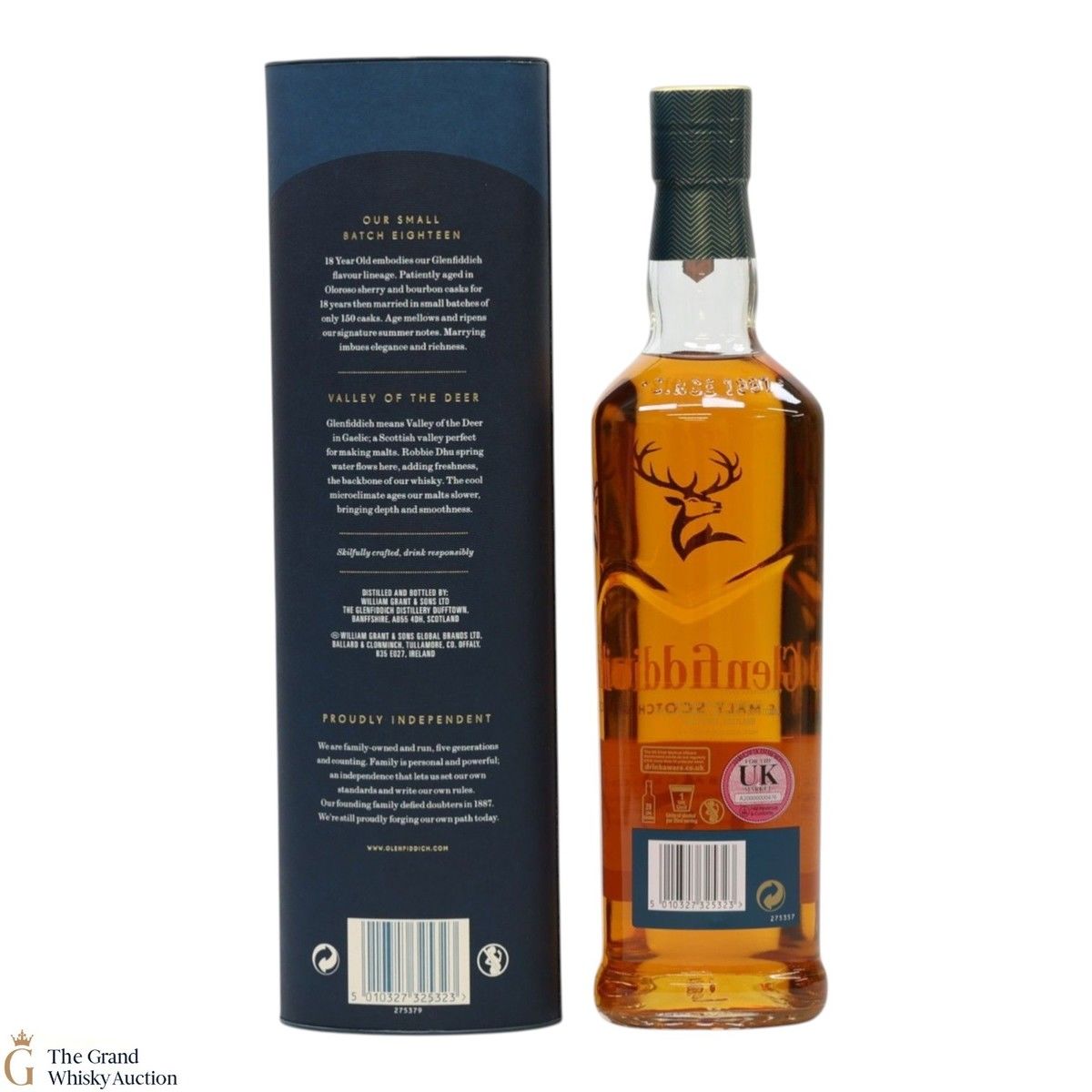 Matured in small batches the Glenfiddich 18 is arguably the most complex in the core range. The single malt has been matured in oloroso sherry and bourbon casks. It is very fragrant with tropical fruit and sherry cask influences, rich baked apple and cinnamon spice compliments by robust oak notes.