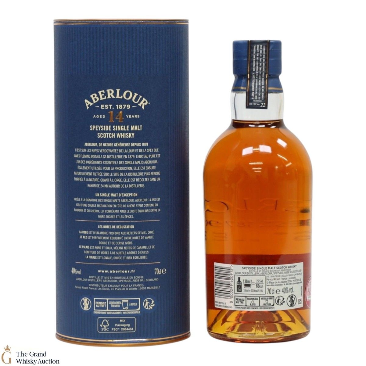 This Aberlour 14 Year Old, has been double cask matured in two handmade oak cask types. The double maturation of both American oak and sherry casks adds depth of character to this single malt, now bottled at 40% abv.