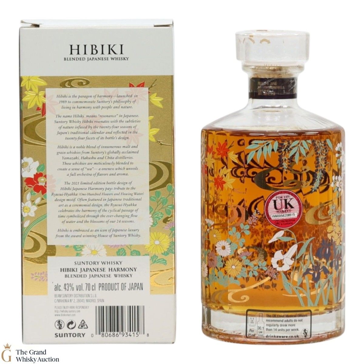 This is a limited edition, specially designed bottle with painted flowers and flowing ribbons of water. The 2021 special edition pays homage to the Ryisui-Hyakka (One Hundred Flowers and Flowing Water) and celebrates different seasonal flowers which help characterise the Japanese seasons. 5 types of casks were used and in typical Hibiki fashion, the bottle always has 24 facets which represent 24 seasons in the Japanese lunar calendar.