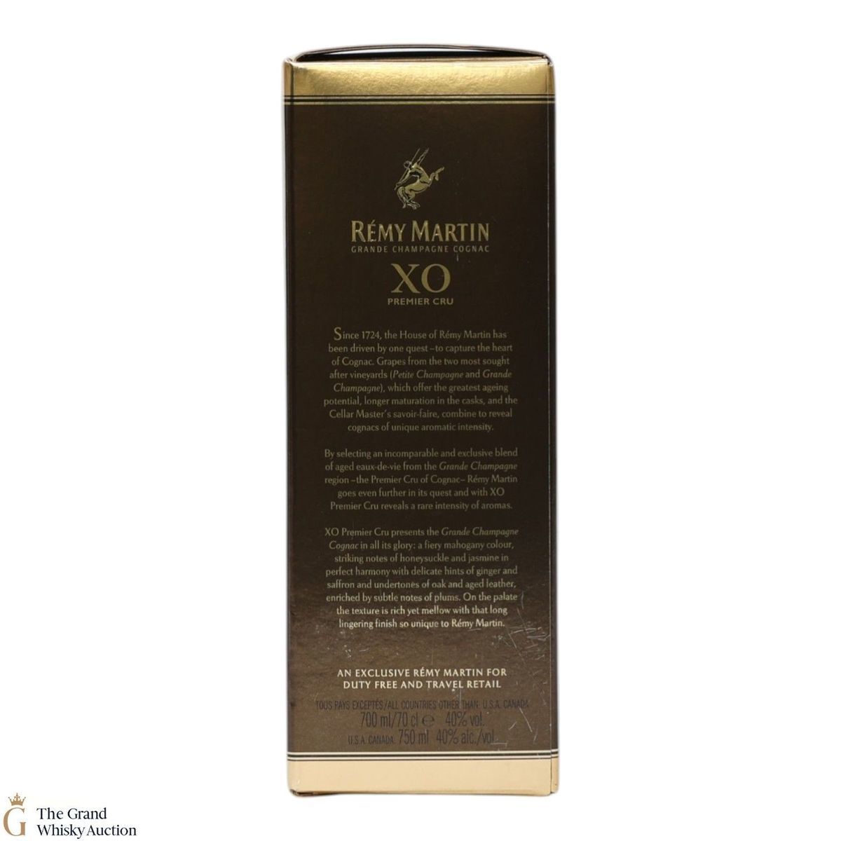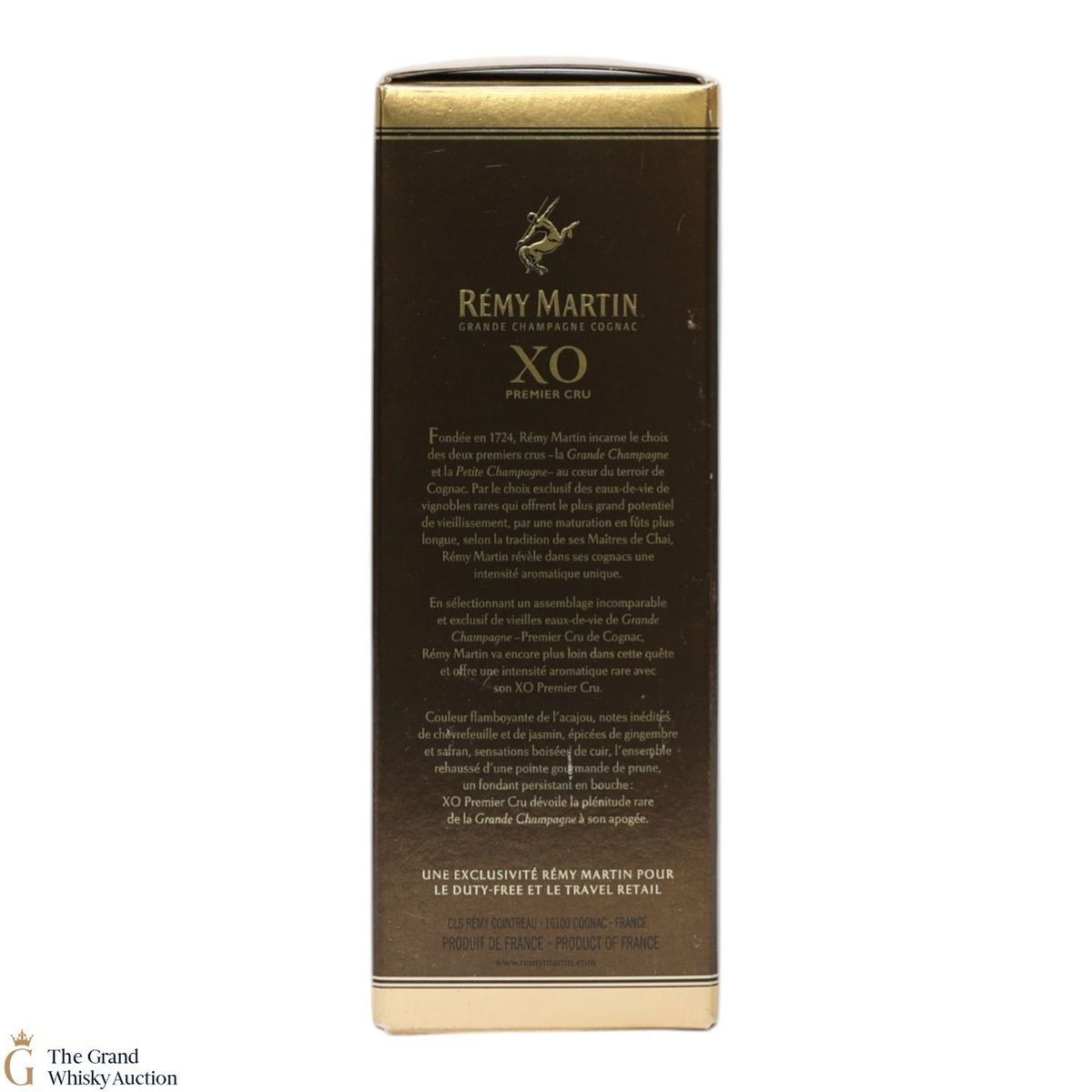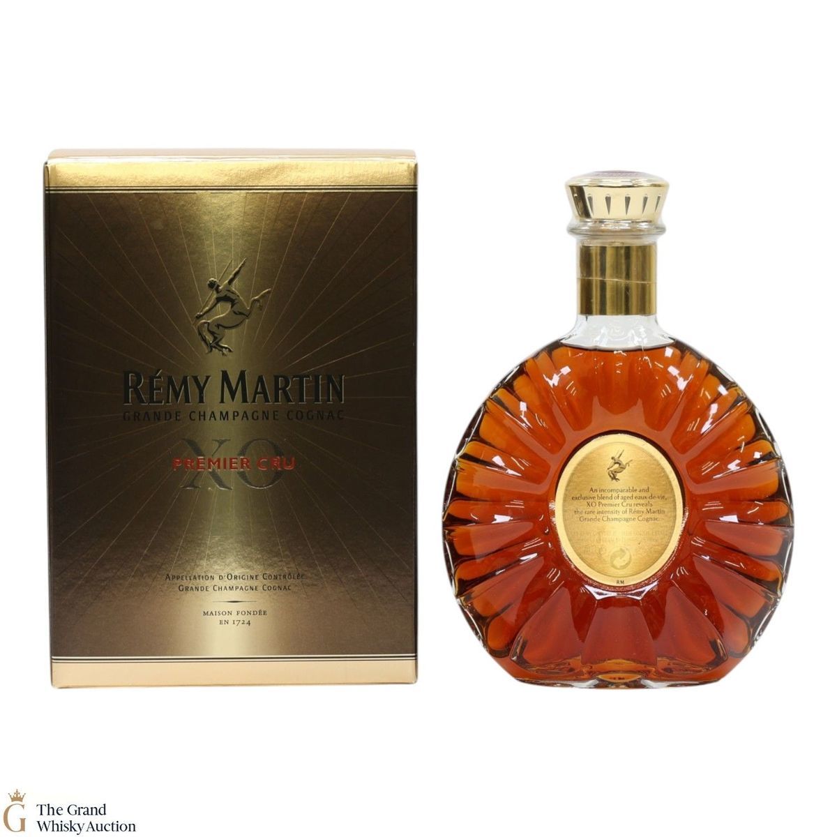 A bottle of Remy Martin XO Premier Cru Grande Champagne Cognac.