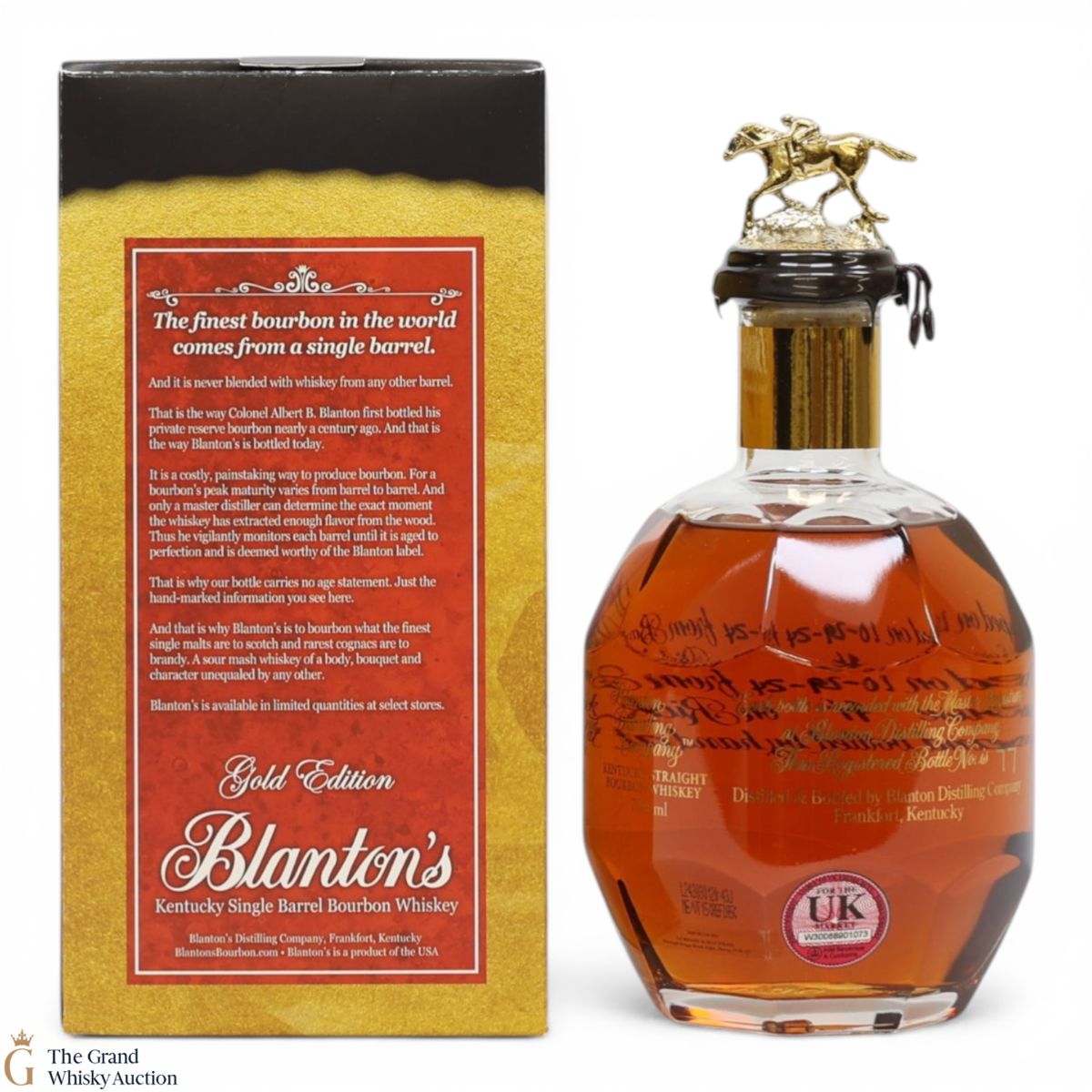 PLEASE NOTE: The wax seal on Blanton's bottles are prone to cracking in transit due to their design. Therefore, as stated in our T&C’s, we do not and will not accept liability should the seal be breached, broken, split or leak in transit. Additionally, please know due to the design of the internal cardboard packaging that surrounds the top of the bottles, it too may be torn. By bidding on this lot you have understood this to be true. Insurance is for complete breakage or loss in transit only.