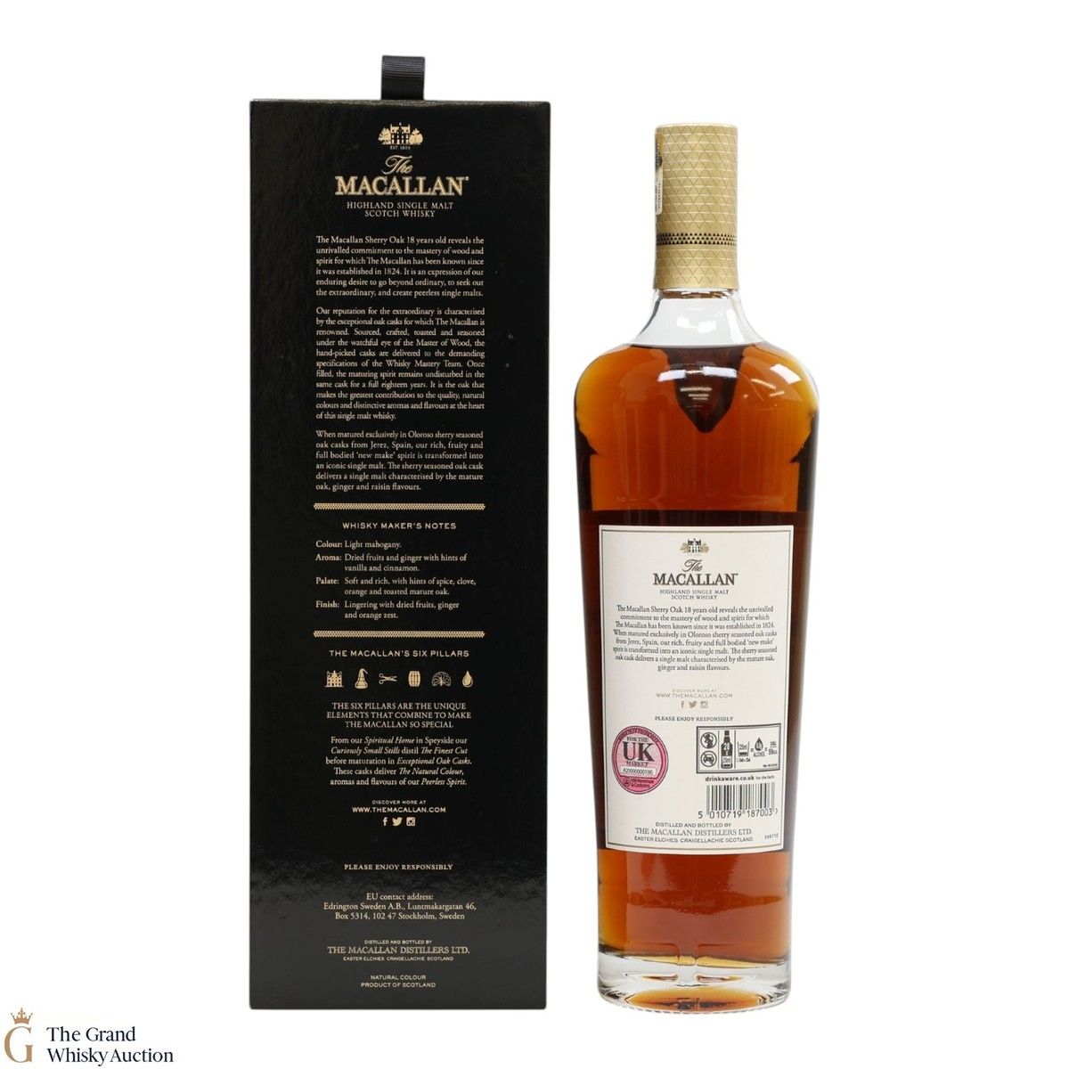 This annual release of The Macallan's popular 18 Year Old Sherry Oak is matured exclusively in sherry seasoned casks, built from both Spanish and American oak, providing a beautifully dark flavour with rich aromas.